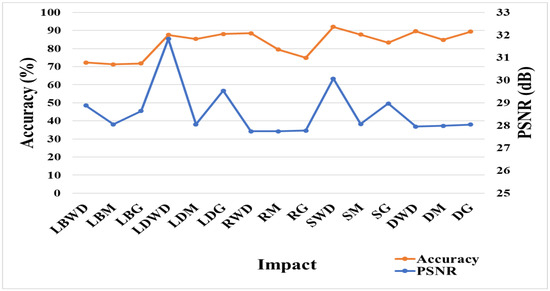 Mean PSNR vs. recognition accuracy in CURE-TSR dataset. Here, LBWD: lens blur without denoising; LBM: lens blur with median filtering; LBG: lens blur with Gaussian filtering; LDWD: lens dirty without denoising; LDM: lens dirty with median filtering; LDG: lens dirty with Gaussian filtering; RWD: rain without denoising; RM: rain with median filtering; RG: rain with Gaussian filtering; SWD: shadow without denoising; SM: shadow with median filtering; SG: shadow with Gaussian filtering; DWD: darkness without denoising; DM: darkness with median filtering; and DG: darkness with Gaussian filtering.