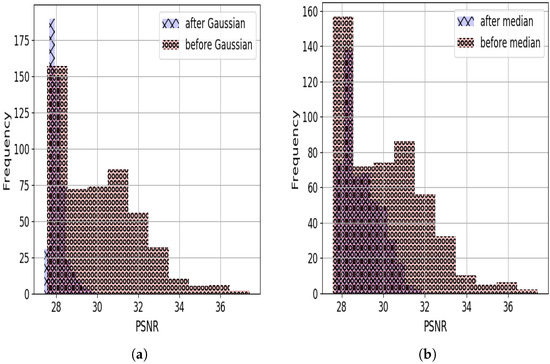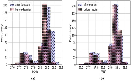 Comparative histogram of PSNR of darkness without denoising and with Gaussian and median filtering for CURE-TSR dataset. (a) Before and after Gaussian filtering. (b) Before and after median filtering.