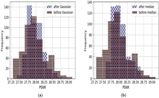 Comparative histogram of PSNR of the shadow without denoising and with Gaussian and median filtering for CURE-TSR dataset. (a) Before and after Gaussian filtering. (b) Before and after median filtering.
