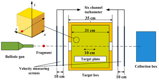 In the experiment, a 12.7 mm caliber ballistic gun was used as the launch carrier for the prefabricated spherical fragments, and the initial velocity of the prefabricated fragments was changed by changing the charge quality in the cartridge. After the prefabricated fragments are fired by the ballistic gun, they will pass through the velocity target in front of the target box (measuring the initial velocity before the fragments penetrate), the medium filling box filled with soil (the front and rear holes of the box do not block the fragments’ penetration trajectory), the velocity target behind the target box (measuring the residual velocity after the fragments penetrate), and finally reach the collection box for the prefabricated fragments. The wires for the front and rear velocity targets are connected to the velocity measuring device. The schematic diagram of the experimental test set-up is shown in Figure 1.