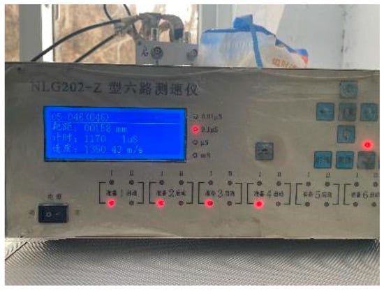 Ballistic gun tests were carried out on 11 mm and 6 mm tungsten alloy spherical fragments using the above device. In Figure 2a, ① is a fragment; ② is the sabot; and ③ is the cartridge. In Figure 2b, ① is the front velocity target; ② is the rear velocity target; ③ is a box for placing soil medium; and ④ is a six-channel speed measurement device (shown in Figure 3) that connects to the conductor of the tachometer. The test speed measurement adopts the on-off test method. The target paper is connected with the wire through the alligator clip, and the six-channel velocimeter is connected with the four target papers in front of and behind the target. When the fragments pass through the two target papers in front of the target box, the velocimeter can measure the time between the two target papers so as to obtain the initial velocity of the fragments. When fragments pass through two pieces of target paper behind the target box, the velocimeter can measure the time between the two pieces of target paper so as to obtain the residual velocity of the fragments.