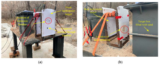 From Table 1, it can be seen that 8 tests were conducted using 6 mm and 11 mm prefabricated tungsten alloy fragments in this experiment, with speeds ranging from 689 m/s to 1761 m/s (6 mm diameter) and 596 m/s to 1325 m/s (11 mm diameter). Fragments with a diameter of 6 mm cannot penetrate soil media with a thickness of 300 mm, while fragments with a diameter of 11 mm can penetrate that soil media. Figure 4 shows the front target and behind target results of fragments penetrating the soil medium in the experiment.