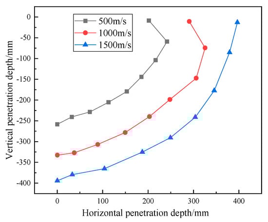 It can be seen from Figure 5 that with the increase in the initial incident angle of fragments, the absolute value of the penetration depth perpendicular to the soil surface gradually and linearly decreases from 0° to 30°. However, the depth value gradually increases after 30°. With the increase in the initial velocity of fragments, the maximum depth difference in the vertical direction is 91.94 mm (60°~70°) at 1500 m/s, and the depth in the horizontal direction is 83.4 mm (20°~30°). However, the length of the penetration trajectory at the end point first decreases and then increases under various velocity gradients, as shown in Figure 6.