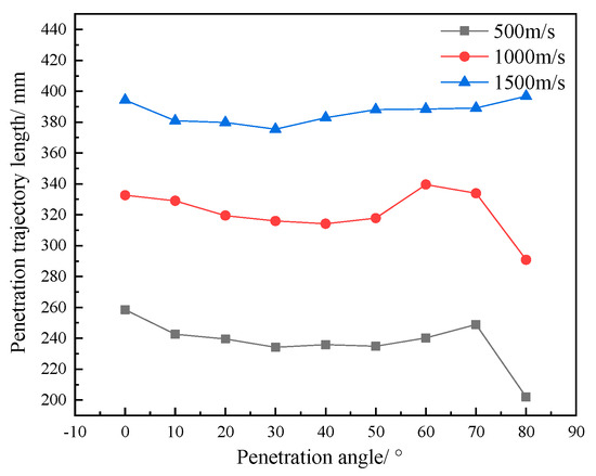 Penetration depth of fragments at different speeds based on variations in penetration trajectory length with initial angle of attack.