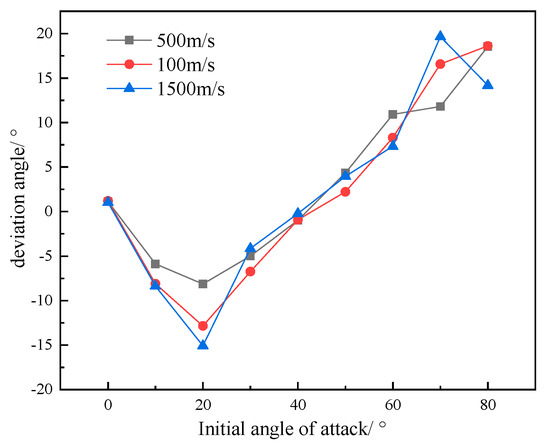 The deviation angle is mainly related to the initial attack angle of the fragments. Figure 8 shows the variation in fragment deviation angle with attack angle under three velocity gradients. Regardless of the initial velocity of fragments, the variation trend of the deviation angle of fragments has similar regularity. As the initial angle of attack increases, the vertical velocity of fragments decreases rapidly while the horizontal velocity increases. With the increase in the angle of attack, the thickness of the soil above the fragment in the process of penetration gradually decreases. This is affected by the free interface effect on the upper surface of the soil medium, causing the upper and lower parts of the fragment to be subjected to different sizes of stress. Consequently, there is a gradual increase in the deflection angle in the process of fragment movement. The speed reduction in the horizontal direction is relatively low. It can be seen from Figure 8 that the deviation angle of fragments is negative in the range of 0°~40° and reaches its maximum value at 20°. The deviation angle of fragments is positive in the range of 40°~80°, and the maximum value is obtained near 80°.