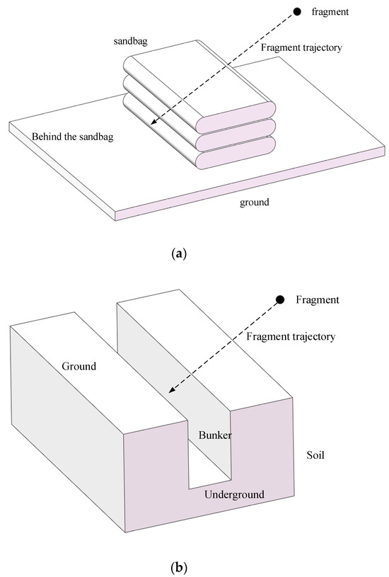 Illustrated schematic diagram of two scenarios. (a) is a schematic diagram of sandbag protection; (b) is a schematic diagram of bunker protection.