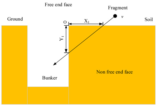 From Figure 9, it can be seen that when determining the source of fragments in a certain direction, people located behind sandbags and in bunkers can only consider the protective effect on one side (the other side is the same). The soil parts located above and to the left are exposed areas that are easily affected by soil-free boundary effects, while the lower and right sides of the soil are non-exposed infinite areas that are less affected by the effects of free interfaces. Based on this assumption, the authors conducted numerical simulation calculations on the penetration of prefabricated fragments with different initial conditions into the soil. The intersection point of two free interfaces was selected as the origin, and the distances X1 and Y1 from the origin O were selected as the entry and exit points of the fragments. The initial velocity of the fragments was 1500 m/s. The working conditions of the numerical simulation are shown in Figure 10.
