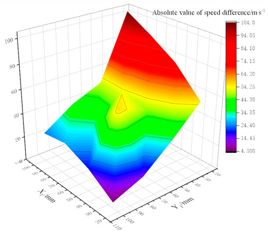 In Table 6, the length of the penetration trajectory is used as the standard for measuring the remaining velocity of prefabricated fragments. If there is a clear functional relationship between the residual velocity and the length of the fragment penetration trajectory, but there is no significant relationship between it and the distances X1 and Y1 from the origin, it can be concluded that the soil does not have a significant boundary effect. Figure 11 shows the three-dimensional relationship between the absolute difference in residual velocity of fragments and the boundary distances X1 and Y1.