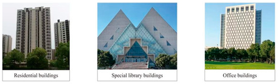The initial step in building recognition involves gathering image data of building objects. This thesis explored two approaches to test the effectiveness of architectural feature recognition. The first approach involves using approximately 500 images of buildings and landscapes, without any specific categorization, in an attempt to identify general buildings. All 500 images used in this test experiment were captured by the author. In the second method, the same type of building is photographed from all angles, and around 30–50 images of the building are identified. In the first method, some identification of architectural features can be achieved. However, this approach yields relatively low accuracy in correctly identifying buildings in panoramic images and fails to classify different types of buildings effectively. Therefore, the second approach was adopted in this thesis to photograph individual buildings and classify them, which involves capturing images of each type of building, such as residential buildings, special library buildings, and office buildings, from various angles. By focusing on specific building types and conducting initial identification of building areas, the system was trained to study the building objects. First, for each type of building, 30–50 images were selected to train the deep learning model on building feature extraction. The image processing procedure primarily involved training the deep learning model on buildings and extracting features specific to each building type. Figure 4 illustrates the training process for different types of buildings, where rectangular bounding boxes were utilized to locate buildings in the images and collect their respective features for subsequent classification. Figure 4 provides a glimpse of some images used for training the feature recognition of administrative buildings.