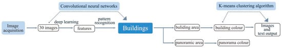 Existing research in this field can be categorized into three main areas. The first area focuses on building recognition within the context of smart city planning. Zou Zhichong et al. [1] discovered that identifying model buildings based on their plan outline features partially reflects the functional characteristics of said buildings. In their study, they identified features of the building’s texture and subsequently classified the building. Additionally, Yan Longxu et al. [2] researched the use of satellite images to extract building contours and classify urban areas into urban and rural construction zones, studying the urban morphology within these areas. However, the proposed region extraction algorithm in their study was found to be complex and have a high demand for accurate building region identification. In the area extraction algorithm, the authors proposed a relatively cumbersome approach with high accuracy requirements, requiring extensive training to ensure the accuracy of the building area extraction. The second area of research concentrates on algorithms for building recognition. Zhang Hua et al. [3] employed MAEU-CNN technology to improve building recognition. However, they encountered the challenges of under-classification and misclassification during the training process, causing the authors to explore the incorporation of building color and shape as additional elements for classification. In a separate study, Xia et al. [4] proposed a CNN framework that successfully retrieved and differentiated building edges, overcoming limitations in image recognition clarity. Similarly, Taoufiq et al. [5] classified buildings based on two benchmarks: Functional purpose and architectural style. They established a predetermined hierarchy within the overall model and differentiated buildings based on color identification. The final area of research focuses specifically on the identification of building colors. Zijian Shi et al. [6] collected data on the colors of residential areas in the functional core of Beijing using GIS imagery, aiming to predict the overall color composition of the area based on the colors of the collected buildings. However, their study lacked a detailed analysis of the specific colors and details of the buildings within the area. Another study conducted by Jin et al. [7] highlighted the potential for the positioning of original buildings based on their exterior color. Based on convolutional neural networks, David Knox and his team identified regional buildings, pinpointing the positional differences between new and older structures within images [8].