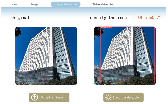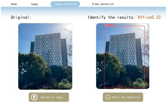 Once the model was established, three types of buildings were randomly photographed from various angles and under different weather conditions to evaluate the accuracy of building recognition after training. The system’s interface is designed. By utilizing the recognition function of the system, the buildings were imported for detection, resulting in successful identification of the buildings in the images and clear categorization of the objects. Additionally, in the presentation of the resulting experimental images, the accuracy of the building recognition was calculated based on the deep learning results and displayed in the rectangular bounding boxes. The accuracy value ranged from 0 to 1, with a higher value indicating a higher accuracy in building recognition.