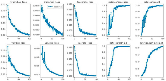 The system primarily relies on YOLO-V5 as its underlying framework, and the binary cross-entropy loss function is utilized during the computation process. Training the model produced promising results, as evidenced by the small difference between the predicted and true values. The training outcomes, as shown in Figure 7, indicate a notable reduction in localization loss, classification loss, and confidence loss, all falling below 0.02. This signifies diminishing errors and accurate target detection. Throughout the training process, the accuracy and recall rates trended upward, with a gradual reduction in the disparity between the actual and predicted selections. When the Intersection over Union (IoU) threshold was set to 0.5, the average accuracy (mAP) was able to reach an impressive 95% for the given category.