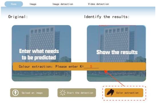 Considering the specific characteristics of architectural colors, the system sets the default value for the K-means clustering algorithm at 5 in this color extraction. However, in this system, K-values are open values. This provides flexibility to the user by allowing them to manually adjust the K-value during the image recognition process. The K-means clustering algorithm is employed to classify the colors in architectural and panoramic images, which extracts the mean values of the K-class colors for each image. The system interface is depicted in Figure 8.