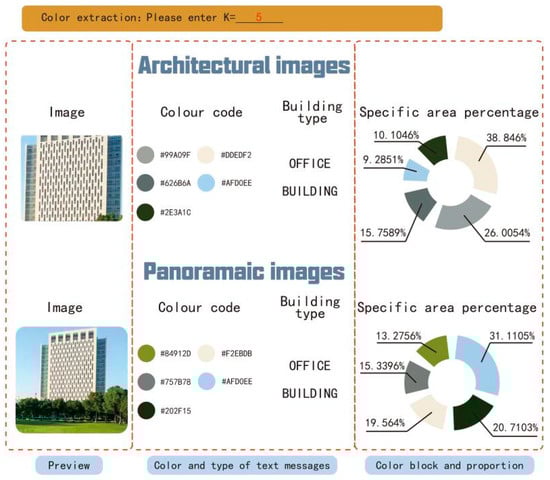 In this test, the colors that occupy the largest proportion of the building’s color in the K-category or close to it are extracted. During the color extraction process, the system identifies and displays the building types within the designated display. It then proceeds to identify the colors from the two types of images based on the building and panoramic images segmented using the system. After previewing the image, the system displays the colors present in the image area and calculates the proportion of each color. Figure 9 illustrates the results of the color extraction for an office building with a specified K-value of 5. The preview section clearly distinguishes between the building color and the panorama color. The extracted color bars visually represent the color scheme, with the size of each bar reflecting the proportion of the color. In the text section, the building type, color code, and specific area percentage are provided. For instance, in the case of office buildings, the color area usage of #DDEDF2 amounts to 38.846%.