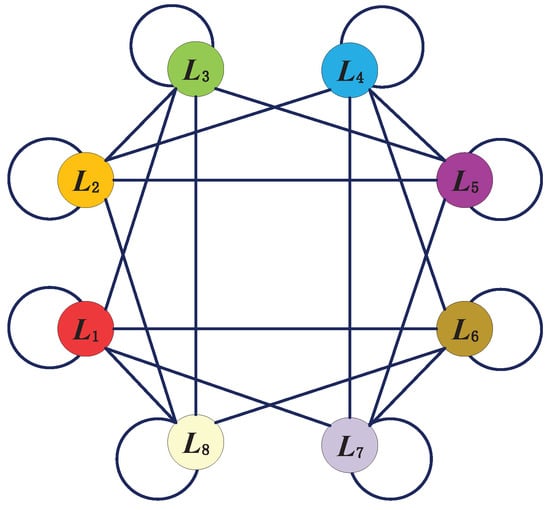 The complexity of the conflict types at intersections determines the difficulty level of traffic control. Typical intersections have 16 conflict points, as shown in Figure 1, which implies that vehicles from different approaching lanes may crash at these points. In addition, each vehicle is under a conflict relationship with its immediately preceding or following vehicle on the same lane, i.e., rear-end collision. We construct a conflict graph to describe the conflict relationships of the approaching lanes, as shown in Figure 2. Define the set of approaching lanes as , where , and the conflict set denotes the set of lanes that has conflict relationships with lane h. Take the westbound straight lane as an example, , which means that the trajectories of vehicles on lane may conflict with those on lanes , , , , and at the intersection. Conversely, vehicles on lane have no risk of collision with other vehicles on the lanes outside the set .