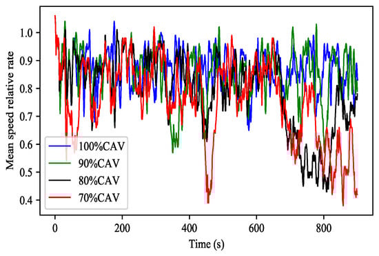 Comparison of the mean speed relative rates for case 3 in 15 min under different penetration rates of AVs.