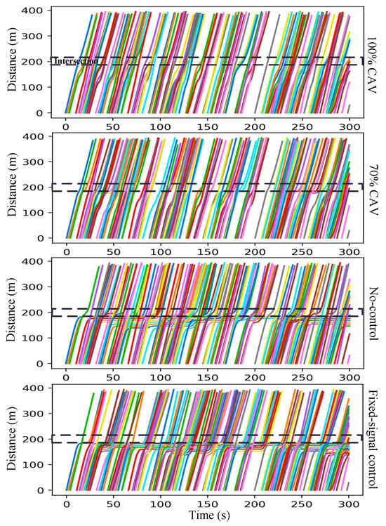 The trajectories of vehicles for case 3 in 5 min under the different strategies.