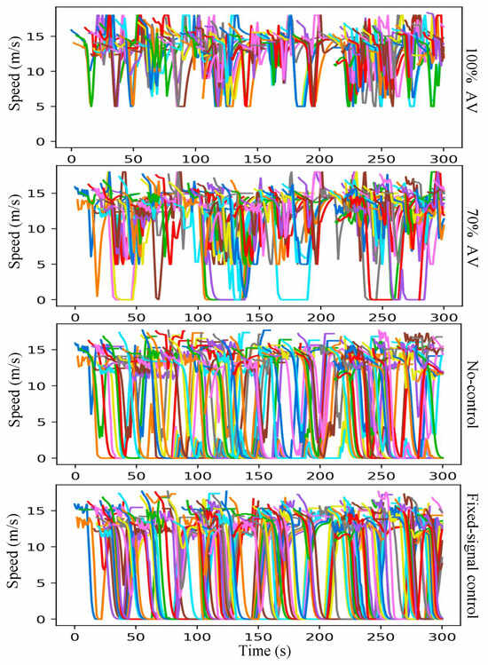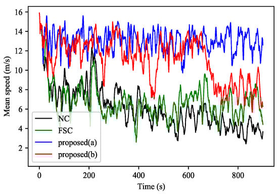 Comparison of the mean speed for case 3 in 15 min under the different strategies: (a) proposed scheme under 100% penetration rate of AVs; (b) proposed scheme under 70% penetration rate of AVs.