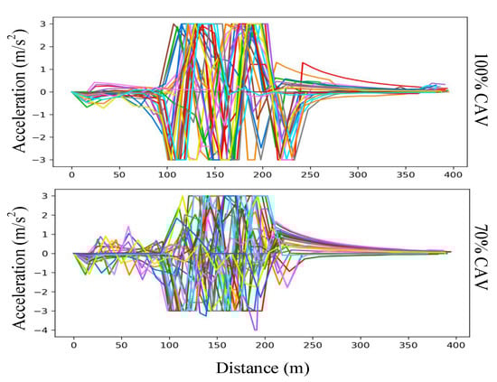 To compare the performance of the proposed scheme with other methods used, we test the no-control (NC) operation and fixed-time signal control (FSC) strategy as benchmark baselines at the same intersection. The NC operation means allowing all vehicles to pass through the signal-free intersection by following the driving behaviors of MVs. The cycle time of the FSC system is set as 82 s. The green times of north- and southbound, and east- and westbound are chosen as 20 s and 15 s, respectively. The clearance time is 3 s. Figure 6 shows the trajectories of vehicles for case 3 in 5 min under the different strategies. It is observed that the vehicles with the proposed scheme in this paper adjust their trajectories after entering the CZ. Especially in the scenario of 100% PRA, the vehicles pass through the intersection smoothly. When the PRA is 70%, a few vehicles stop at the intersection. In contrast, the vehicles under NC or FSC frequently stop at the intersection, and lots of queues are formed. Figure 7 shows the speeds of vehicles for case 3 in 5 min under the different strategies. Corresponding to the results in Figure 6, the vehicles using the proposed scheme always pass the intersection without halting (speed greater than zero) under 100% PRA, and a small number of vehicles slow down to zero at the intersection under 70% PRA. When NC or FSC is adopted, more vehicles slow to a stop at the intersection. The above phenomena indicate that the proposed scheme in this paper notably outperforms NC and FSC in smoothing traffic flow and improving mobility. Figure 8 shows the acceleration curves of vehicles with respect to distance under the proposed scheme for case 3 in 5 min. We can easily observe that the vehicles adjust their acceleration significantly after entering the CZ. Notice that the maximum acceleration and deceleration of MVs are 3 m/s and 4 m/s in the scenario of 70% PRA, respectively, while the maximum acceleration and deceleration of AVs are both 3 m/s.