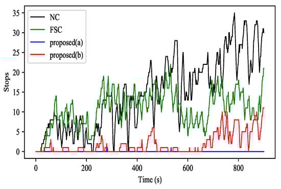 Comparison of the number of stops for Case 3 in 15 min under the different strategies: (a) proposed scheme under 100% penetration rate of AVs; (b) proposed scheme under 70% penetration rate of AVs.