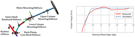 Accordingly, we modeled our vehicle in a multi-body simulation environment and modeled a separate EPS system to incorporate the steering system characteristics. To enhance the reliability of the steering characteristics, we applied the friction model shown in Figure 8, which includes various components, such as rack gear operation friction and damping, motor gear interlocking friction and damping, the stiffness characteristics of the steering force transmission members, and motor rotation dynamics’ characteristics.