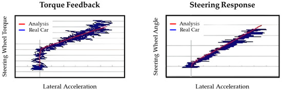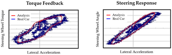 In modeling the competitor vehicle, we obtained data through testing on a test bench to incorporate the characteristics of the chassis elasticity, friction, and steering system via a similar modeling process as that of our vehicle. To validate the implementation results, the lateral response of the actual competitor vehicle was compared with that of the simulated vehicle, as shown in Figure 12. This validation was performed for the vehicle model while excluding the EPS control system. The steering feel is implemented in Section 3.3 based on the reliable competitor vehicle model obtained.