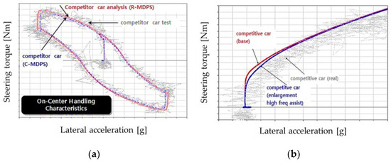 Applying the steering system of our vehicle to the target vehicle (Figure 20, red line vs. black line) revealed an overall decrease in steering torque due to excessive power assist. In addition, a decrease in the gradient was observed in the off-center region, which did not provide proper feedback to the driver.