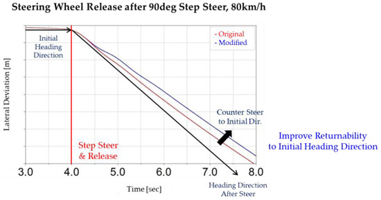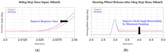 When setting the damping gain to satisfy damping feel and stability, the level of resistance to driver steering increased, resulting in a delay in the initial response to rapid steering, such as step steer. However, applying the proposed method, the required torque at the initial steering phase was reduced, leading to the tire steering angle increasing, as shown in Figure 16a. In addition, the effect of damping on returnability was observed in hands-off situations, and improved returnability could be confirmed through the proposed methods, as shown in Figure 16b.