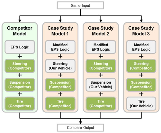 This study aimed to evaluate steering feel performance by analyzing our vehicle and a competitor’s vehicle, known for its excellent steering feel, using a multi-body simulation model. Constructing a full vehicle model in the simulation environment enables an independent analysis of the various factors that influence steering feel, making it essential for a comprehensive interpretation of steering feel. While previous studies focused on analyzing the individual elements that affect steering feel, we approached the analysis from a component perspective to identify the most efficient direction to modify the steering feel of our vehicle. For example, if achieving the desired steering feel through the least costly method, such as tuning the EPS control system, is not possible, the analysis becomes even more important. It then becomes necessary to consider whether developing a new control system or conducting a suspension design revision with the tuned existing control system would be more effective in achieving the desired steering feel. However, in situations where the influence of the control system alone cannot resolve the issue, the aforementioned choices may be initially unsuitable. Therefore, in this study, we conducted a sensitivity analysis using our vehicle and a target vehicle to determine how to modify the factors and derive the most efficient combination when modifying a single factor does not yield the desired objectives. These benefits outweigh the costs associated with reverse engineering. Based on the aforementioned background, our initial focus was on establishing objective indices for steering feel through subjective–objective correlation studies. Subsequently, we reverse-engineered the competitor vehicles. Lastly, we proposed a design method to overcome the trade-off relationship between reducing initial torque due to friction and increasing stability by damping, enabling us to emulate the desirable steering feel of the reference vehicle.