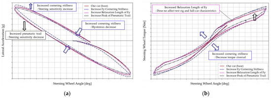 The tire characteristics are important in that they can be modified to improve the performance of a vehicle without changing the suspension. Therefore, we conducted a sensitivity analysis on the main parameters of the tires. First, as shown in the lateral acceleration vs. steering angle graph in Figure 21a, an increase in the cornering stiffness of the tire simultaneously results in improved steering sensitivity and maximum lateral acceleration. Furthermore, it decreases the width of the hysteresis curve, improving the initial response characteristics and reducing the lateral acceleration lag time. Second, as the lateral acceleration lag time decreases, the build-up characteristic, as shown in Figure 21b, increases, and the steering wheel torque loss in the on-center section decreases. Lastly, as the pneumatic trail intensified, and the build-up characteristic under the returnability effect, on-center steering wheel torque loss, and lateral acceleration lag increased.