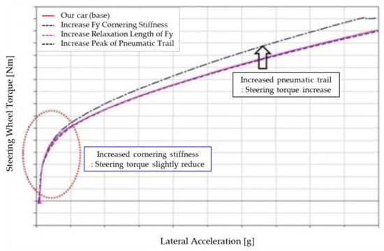 As the pneumatic trail intensified, the build-up characteristic, as shown in Figure 22, also intensified due to restoration effects, known as the aligning moment. This is the same principle as increasing the caster trail. Tire cornering stiffness determines the lateral acceleration response characteristics under the steering angle input and, therefore, has little effect on the steering wheel torque characteristics under lateral acceleration.