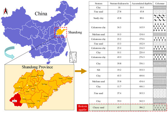 The test materials were selected from the bottom of deep strata of the same depth of approximately 540~580 m underground near the Guotun Coal Mine shaft in Yuncheng, Shandong Province, as shown in Figure 1. The bottom aquifer soil sample was identified as clayey sand, and its natural physical indexes are shown in Table 1.