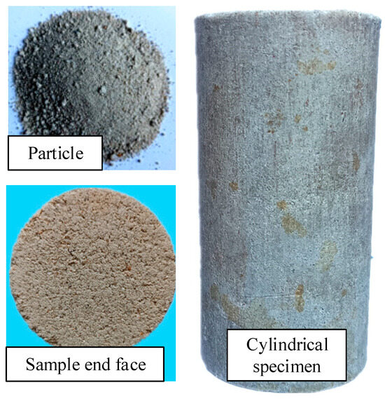The preparation of clayey sand samples followed China’s national standard geotechnical test method [31]. First, the initial wet weight of the original soil samples was measured by taking representative samples from the coal mine coring site, and the initial moisture content of the original soil samples was determined after drying in the laboratory. According to the requirement of a 10% water content, the test soil was evenly mixed, and after standing in a sealed container for 24 h to ensure that the water content in the soil was uniform, according to the test scheme, five consolidation pressures (1, 2, 4, 6 and 8 MPa) were used to prepare reshaped clayey sand samples with a standard cylindrical sample size of 𝜙50 · 100 mm. In order to show that undisturbed soil samples have a certain structure after long-term consolidation [26], reshaped clayey sand samples were consolidated for 15 days under five consolidation pressures, and the samples formed by long-term consolidation under high stress are shown in Figure 2.