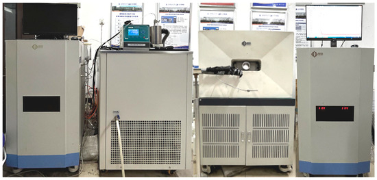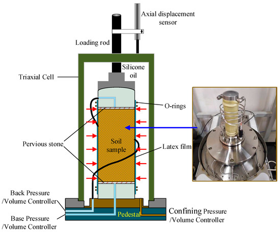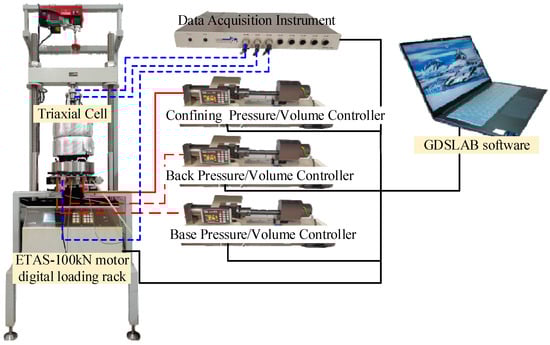 Aiming at the mechanical characteristics of high overlying total stress and a high water pressure in the permeability path of the bottom aquifer of thick alluviums, in order to study the nonlinear seepage law of bottom aquifers under different stress levels, the ETAS customized by Anhui Jianzhu University in the GDS Company of the United Kingdom was selected to design high-stress and high-water-pressure permeability tests. The ETAS meets the triaxial and permeability test requirements of deep soil under high-stress conditions, and it can provide a maximum of 32 MPa. As shown in Figure 3, the system can realize back pressure saturation, B-value detection, standard triaxial test, stress path tests, K0 consolidation tests and other user-defined test schemes. The axial stepper motor realizes the control of axial displacement. The pressure–volume controller realizes the control of confining and back pressure and the measurement of drainage volume. The axial load sensor measures the axial load. The pore pressure sensor realizes the measurement of pore water pressure at the bottom of the sample.