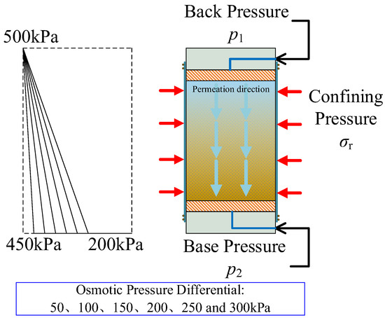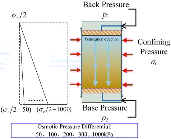 A direct loading permeability test of clayey sand with low- and high-confined water was conducted at five levels, namely, 1, 2, 4, 6 and 8 MPa, with 2–4 samples at each level. Schematic diagrams of the permeability test of low- and high-confined water are shown in Figure 5 and Figure 6, respectively.