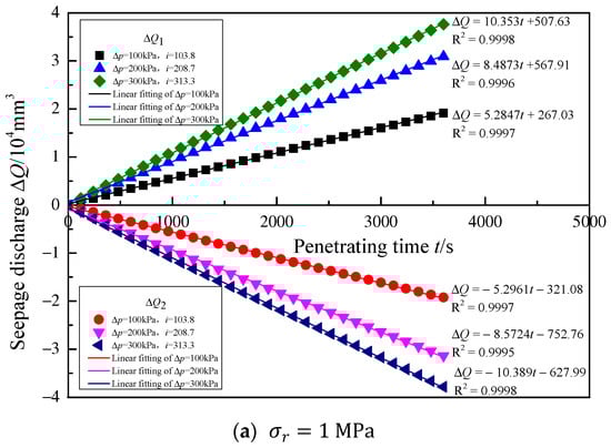 In Figure 7 and Figure 8, it can be seen that when the was low, the time–history curves of the seepage discharge of low- and high-confined water showed good linear correlation under different values. Among them, the linear fitting degree of the seepage discharge time–history curves of low-confined water seepage and high-confined water seepage were noted, with an above 0.99. When the was high, the linearity of the time–history curve of the seepage discharge of low-confined water decreased, and seepage did not occur gradually; however, the time–history curve of the seepage discharge of high-confined water still had a good linear correlation. Because this seepage test adopted the steady-state seepage method with a constant head, the p1 was constant during the test, and the p2 was adjusted to a constant value at the beginning of the test, resulting in a slight change in the volume of the base pressure/volume controller at the beginning of the seepage test. Therefore, for the same seepage test, the absolute values of the intercept of the time–history fitting curve of the were all greater than the absolute values of the intercept of the time–history fitting curve of the .
