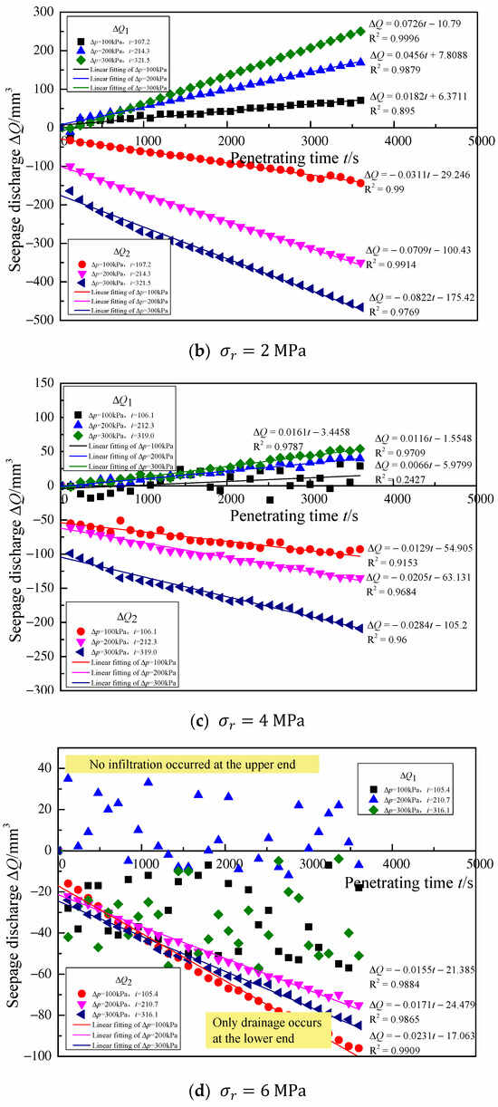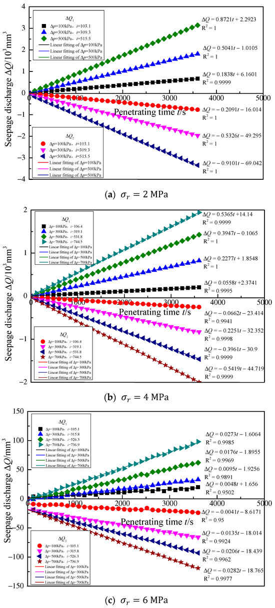 In the low-confined water seepage test, the p1 was 500 kPa and the p2 was 450, 400, 350, 300, 250 and 200 kPa in turn (that is, the was 50, 100, 150, 200, 250 and 300 kPa in turn).