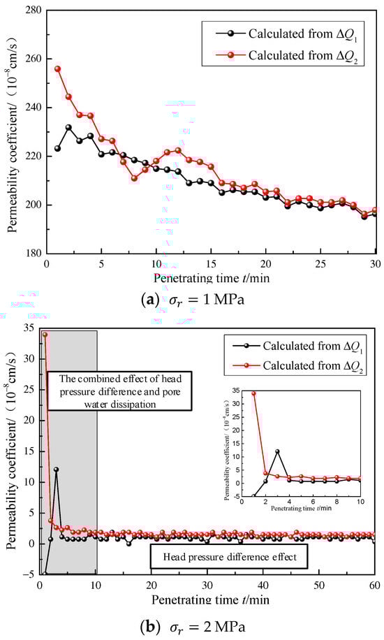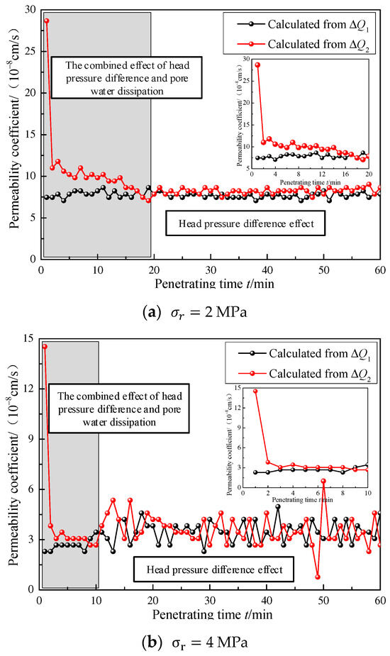 At the beginning of the permeability test, the back pressure/volume controller filled water into the sample, and the back pressure/volume controller received the drainage from the sample. The time–history curve of the had a certain lag compared to that of the . When the was low, the and changed almost simultaneously, and the time–history curves all showed a good linear relationship, while the time–history curve of the had a small lag. With an increase in the , the time–history curves of the seepage discharge of low- and high-confined water gradually fluctuated, and the was less than the , with the time–history curve of the obviously lagging behind. The reason is that the internal seepage discharge of the sample came from the joint action of the head pressure difference and internal pore water dissipation. With permeability under a low , the and were mainly affected by the head pressure difference, and the influence of the internal pore water dissipation was negligible compared to the head pressure difference. As the increased, the sample became compacted and the permeability decreased. The changes in the head pressure difference and internal pore water dissipation on the and cannot be ignored. Among them, the was mainly caused by the head pressure difference that resulted from a drop of the p2, while the change in the came from the dissipation of the internal pore water near the lower end of the sample caused by a sudden drop in the water head in the early stage. As the influence of the internal pore water dissipation spread to the upper end of the sample, the change in the was gradually influenced by the head pressure difference.