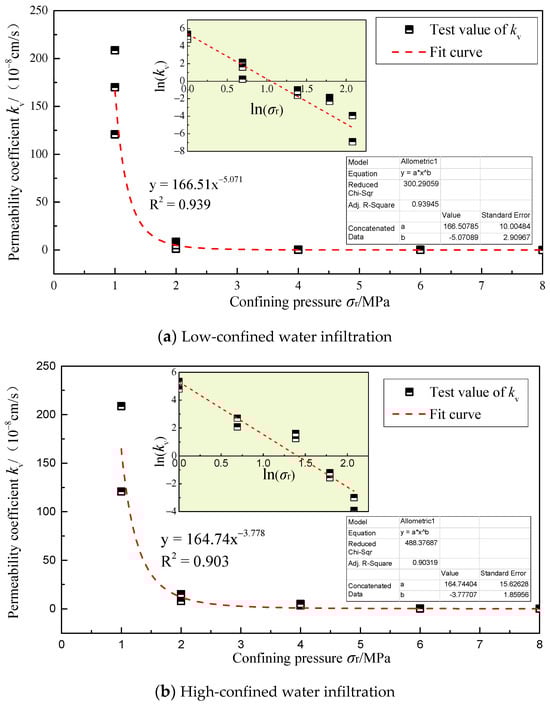 With an increase in the , the pore structure in the sample changed, and the seepage pore gradually narrowed and closed, leading to a decrease in its permeability coefficient. In order to show the nonlinear decreasing relationship of the permeability coefficient of the clayey sand sample with an increasing , the power function was used to fit the test results:
