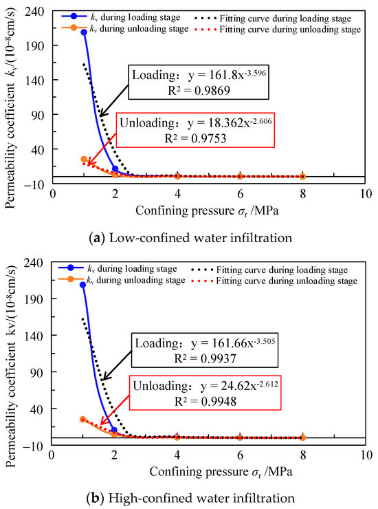 In the process of the graded loading–unloading permeability test of clayey sand with low- and high-confined water, a constant was set for the same sample, while the was increased step by step first and then reduced step by step according to the original path after reaching the target . The initial of the sample was 1 MPa, with the maximum being 8 MPa and the loading–unloading path of the sample being 1 MPa → 2 MPa → 4 MPa → 6 MPa → 8 MPa → 6 MPa → 4 MPa → 2 MPa → 1 MPa.