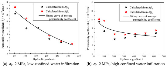 When values of 2 and 4 MPa were applied to the clayey sand samples, respectively, permeability tests with different hydraulic gradients were performed while keeping their constant, and the relationship curve between and under the same could be obtained, as shown in Figure 13. The curve shows that the variation law of low- and high- permeability coefficients with an increasing was completely different.