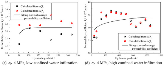 Relationships between the permeability coefficient (10−8 cm/s) and hydraulic gradient in loading–unloading process.
