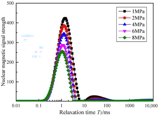 According to the relaxation principle of low-field NMR, water in small pores experiences greater surface relaxation, so it relaxes faster than water in large pores. Therefore, the distribution is similar to the pore size distribution, in which each relaxation time corresponds to the pore size: Larger pores correspond to longer relaxation times and smaller pores correspond to shorter relaxation times [40]. Bai Songtao [41] proved that the pore structure corresponds to the spectrum distribution one by one through a mercury injection test; that is, the larger the pore throat diameter, the greater the corresponding value.