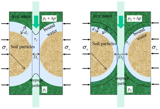 Pores in clayey sand and pore water play a decisive role in the seepage process. Because the bound water near the surface of soil clay particles has shear strength (), its distribution decreases exponentially with the distance from the surface of clay particles. Under a certain water head or consolidation stress, some bound water with a smaller is in a flowing state, while some bound water is in a solid-like state. Therefore, only some of the bound water is in a moving state in those pores filled with bound water, and that in the pores where bound water can flow is called a seepage hole, and its diameter is called the seepage diameter.