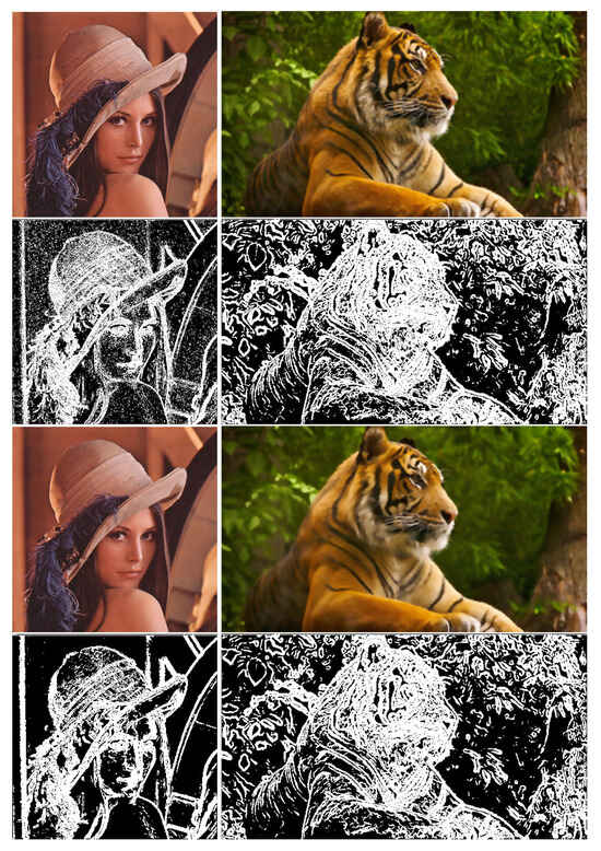 Illustration the effects of the adaptive model. From top to bottom, the original images, the result of applying the Sobel filter, then the result of applying the adaptive algorithm, and finally the result of applying the Sobel filter. The application of the proposed adaptive method reduces the number of noise and contour points for the Lena image from 21,571 pixels to 19,552 pixels (a reduction of 9.35%) and for the Tiger image from 15,600 to 14,374 (a reduction of 7.86%).