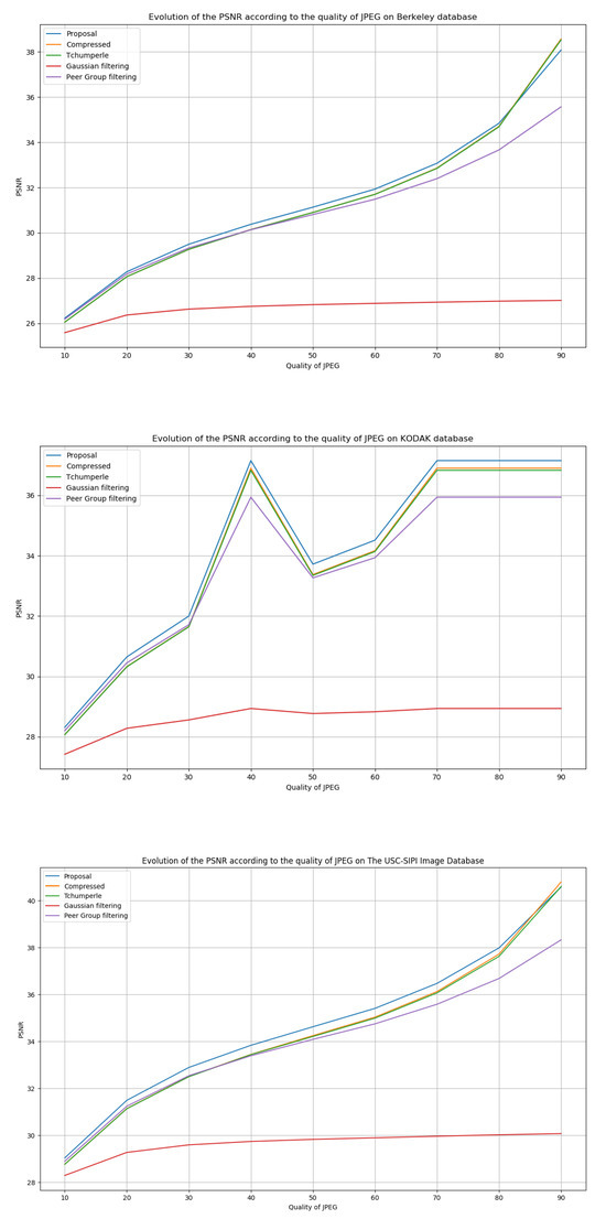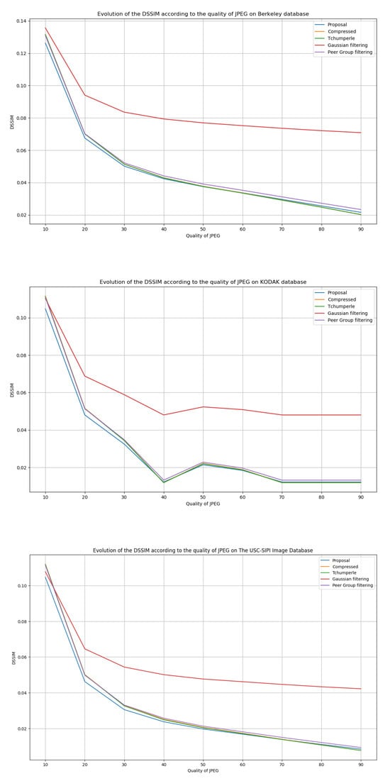 In a second step, we compare one side of the original image with the compressed image and the other side with the compressed image after applying our filtering. We used other filtering algorithms in the evaluation process. The method of D. Tschumperle [] was used, which consists of regularising an image by an anisotropic smoothing process based on PDEs. This model requires parameterisation for its implementation, so we used standard values given in the literature. Gaussian filtering was used, which consists of applying a Gaussian filter to the rows and then to the columns of the image. Peer group filtering was used, which allows an image to be smoothed by replacing a pixel with the weighted sum of its closest neighbours in terms of colour distance. The purpose was to observe whether our proposal leads to improvements in terms of visual rendering, especially in the case of high losses. The results obtained with PSNR and DSSIM are shown in Figure 11 and Figure 12 (for PSNR, a higher value is better, whilst for DSSIM, a lower value is better).