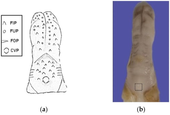 (a) Diagram illustrating the four distinct types of papillae on a rat’s tongue. FIP: filiform papillae, FOP: foliate papillae, FUP: fungiform papillae, and CVP: circumvallate papillae. (b) Photograph of a rat tongue highlighting the sample collection area, indicated by the dotted region. While the sizes of the collected samples slightly varied, they typically measured 5 mm × 5 mm.