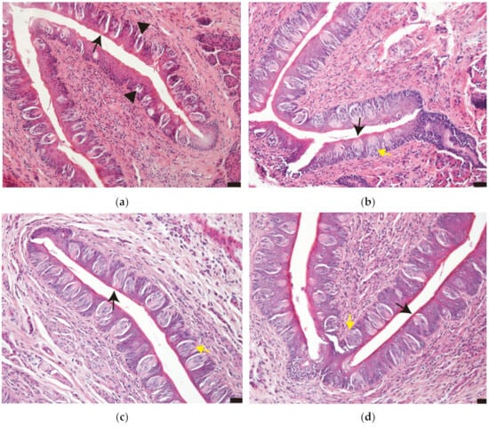 Photomicrographs of H&E-stained taste buds in the circumvallate papillae. In image (a), degenerative changes can be observed, along with a scarcity of taste pores (arrowhead). Conversely, images (b–d) showcase taste buds that are densely packed with cells (yellow arrows) and exhibit multiple taste pores (arrows). (a) Diabetic control subgroup (STZ); (b) diabetic experimental subgroup (STZ/4HR); (c) healthy control subgroup (control) and (d) healthy experimental subgroup (4HR). (Original magnification, ×200, bar = 50 µm).