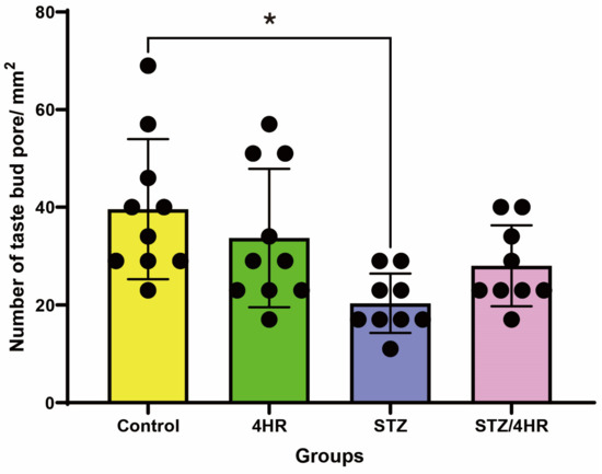 Comparison of the number of taste bud pores across different experimental groups. The control group showed a mean of 39.6 ± 14.3 pores/mm2. In contrast, the 4HR, STZ, and STZ/4HR groups exhibited means of 33.7 ± 14.2, 20.3 ± 6.1, and 28.0 ± 8.3 pores/mm2, respectively. A statistically significant difference was observed between the control and STZ groups (* p = 0.005).