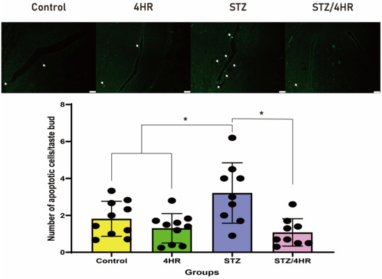 Circumvallate papillae TUNEL staining. TUNEL-positive nuclei (indicated by arrows) are observable both within the taste bud profile and the epithelium. The diabetic experimental subgroup (STZ/4HR), healthy control subgroup (control), and healthy experimental subgroup (4HR) all showed fewer TUNEL-positive taste bud cells compared to the diabetic control subgroup (STZ) (Original magnification, ×200 without counterstaining). Quantitative analysis highlighted a significantly greater number of TUNEL+ cells in the STZ group in contrast to the control, 4HR, and STZ/4HR groups (* p < 0.05).